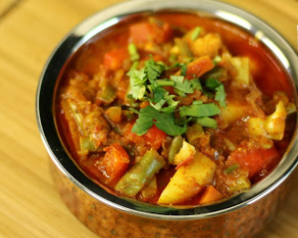 Pakora mixte, Agneau vindaloo, riz basmati, cheese nan, dessert halwa suji